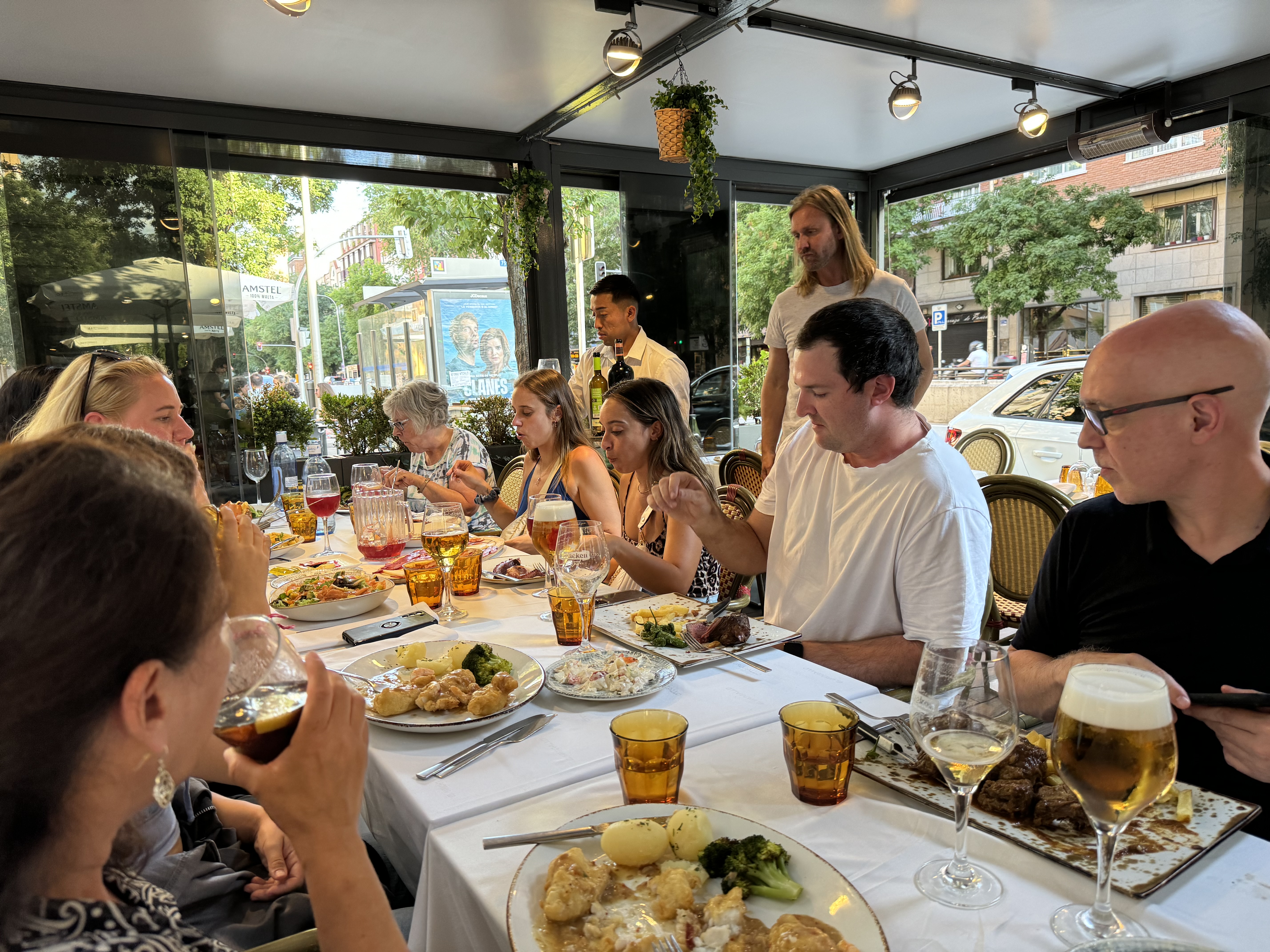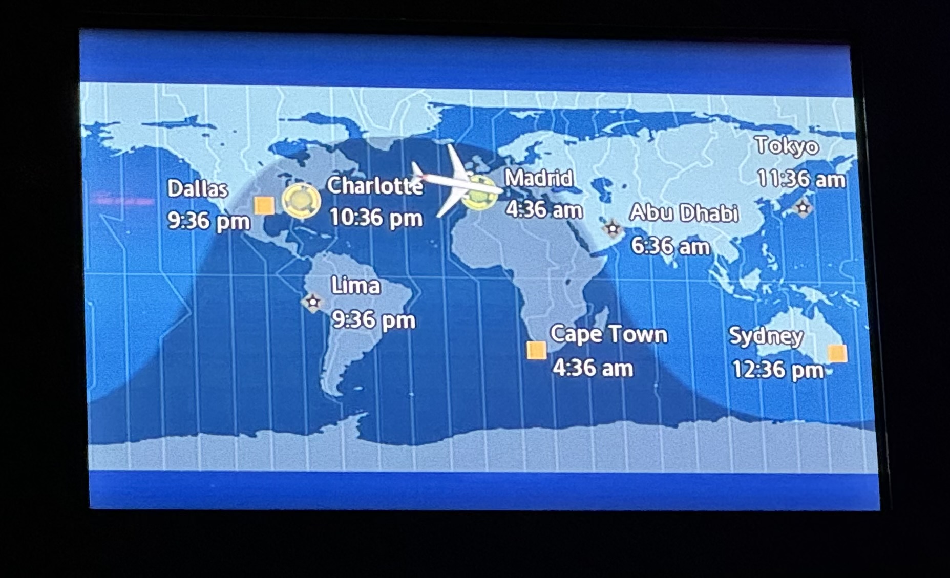 We had an uneventful, overnight, 7.5 hour flight direct from Charlotte to Madrid. We thought ahead and booked the exit row so we were able to stretch out and relax a little. In what seems to be the norm, Laurie didn’t sleep at all and Matt was able to get a few hours of sleep in.