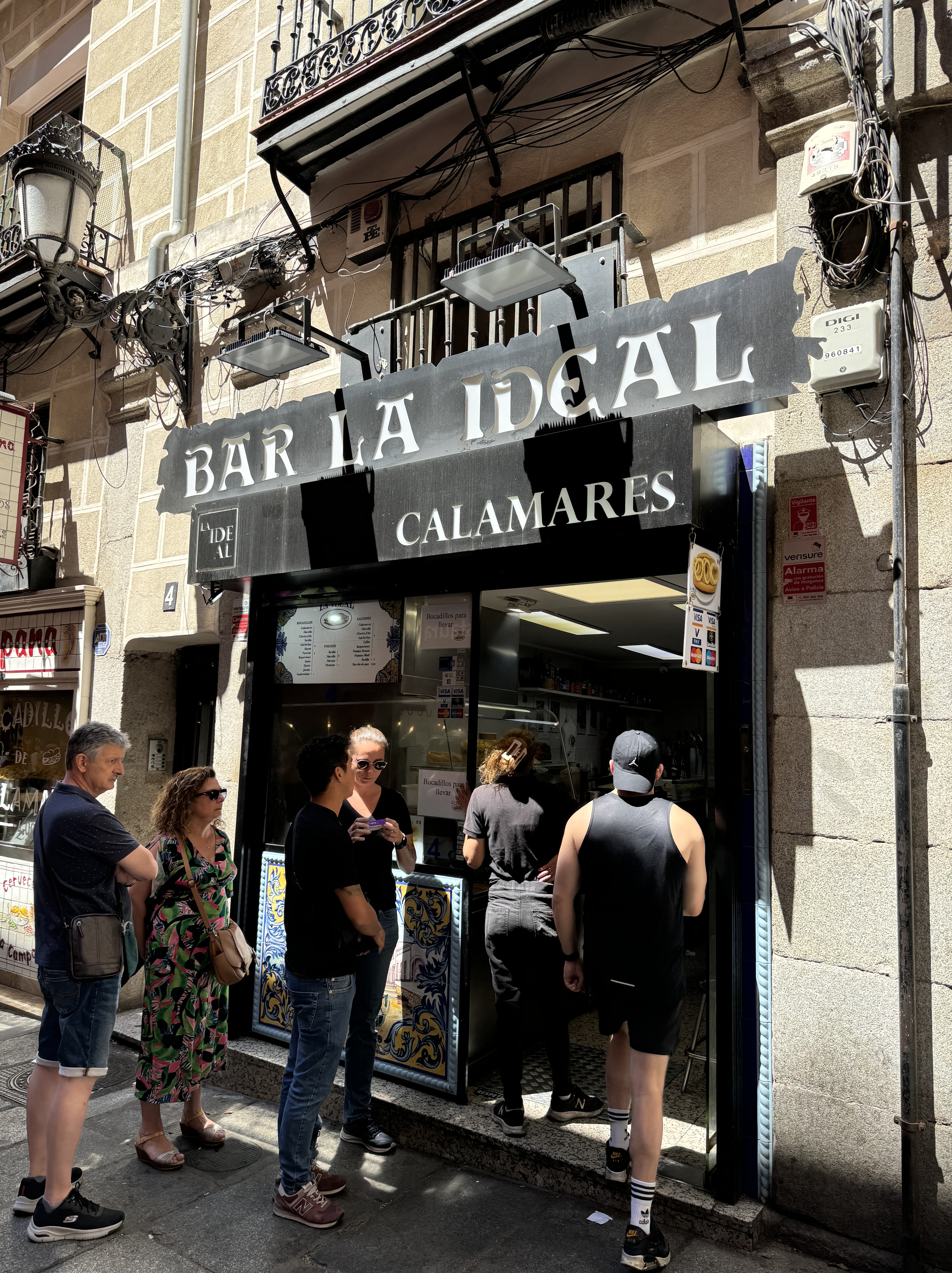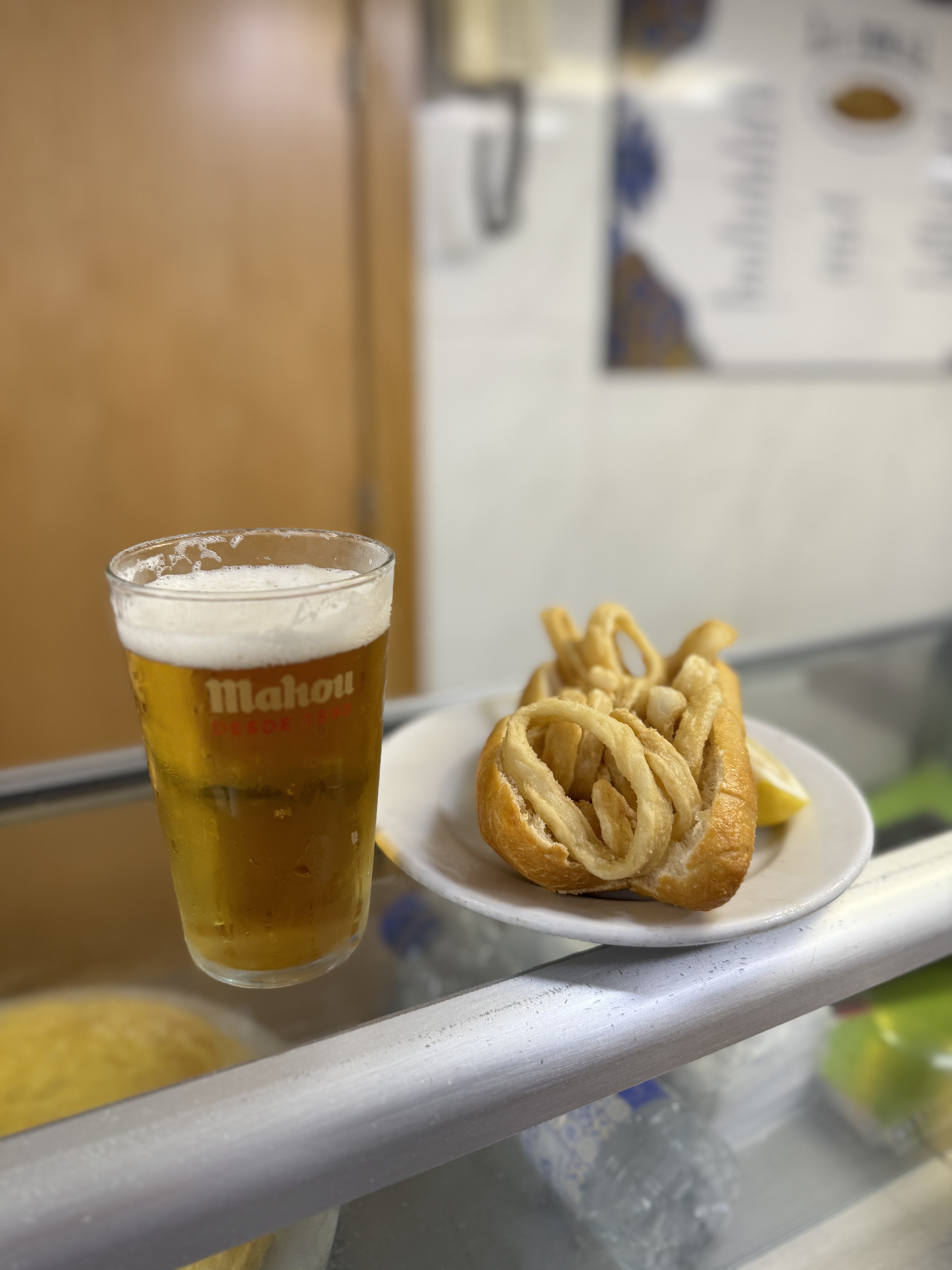 - La Ideal: Calamari sandwich, olives, patatas bravas and local beer (Mahou).